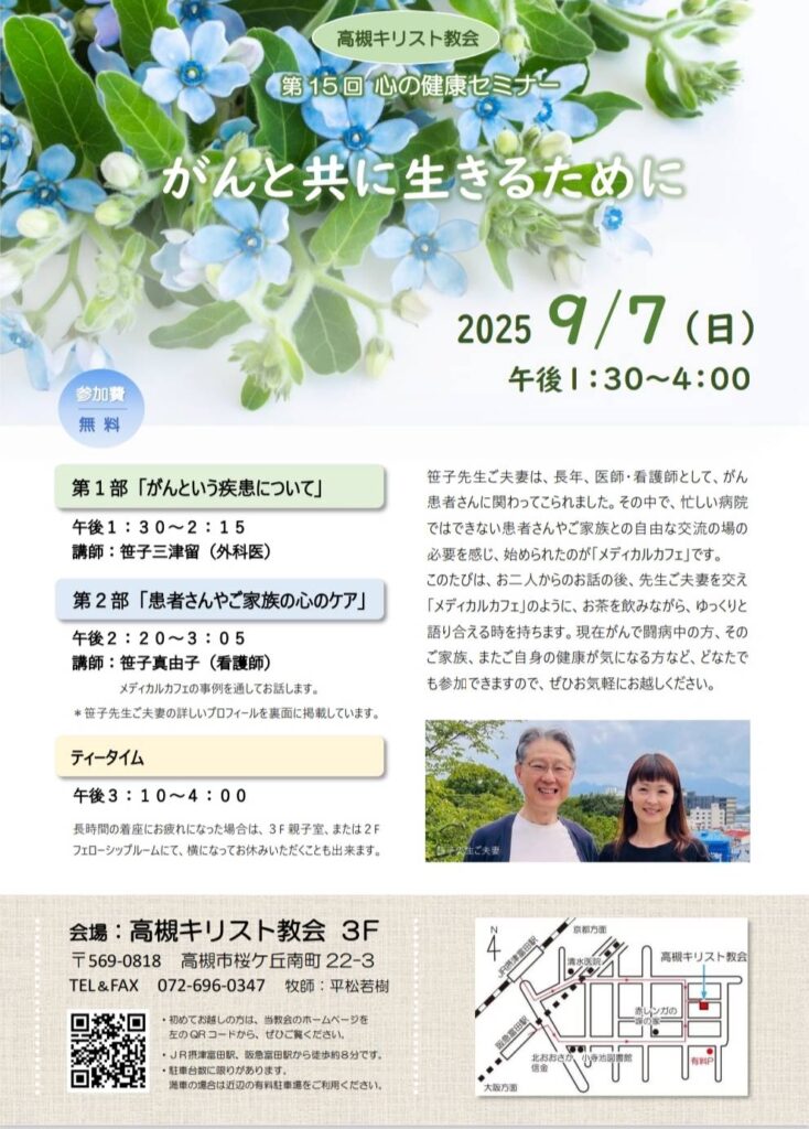 2025年9月7日(日)午後1時半~4時 第15回 心の健康セミナーを開催いたします。今回は「がんと共に生きる」と題して、腫瘍外科医であり淀川キリスト教病院理事長の笹子三津留様と、ご夫人で看護師の笹子真由子様をお招きし、がんという疾患について、また患者さんやご家族の心のケアについてお話いただきます。