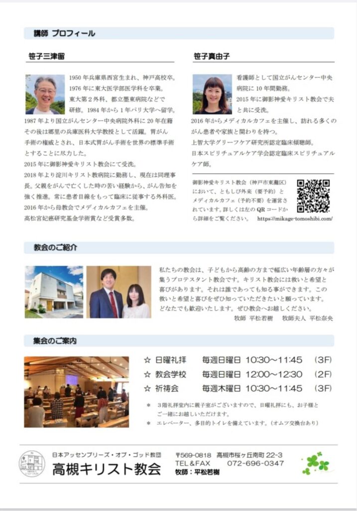 今回のセミナーでのお話の後も、笹子ご夫妻を交えて「メディカルカフェ」のように、お茶を飲みながら、ゆっくりと語り合える時を設けております。現在がんで闘病中の方、そのご家族、ご遺族、医療関係者の方、またご自身の健康にご関心のある方など、どなたでもご参加できますので、ぜひお気軽にお越しください。(参加費は無料です。)